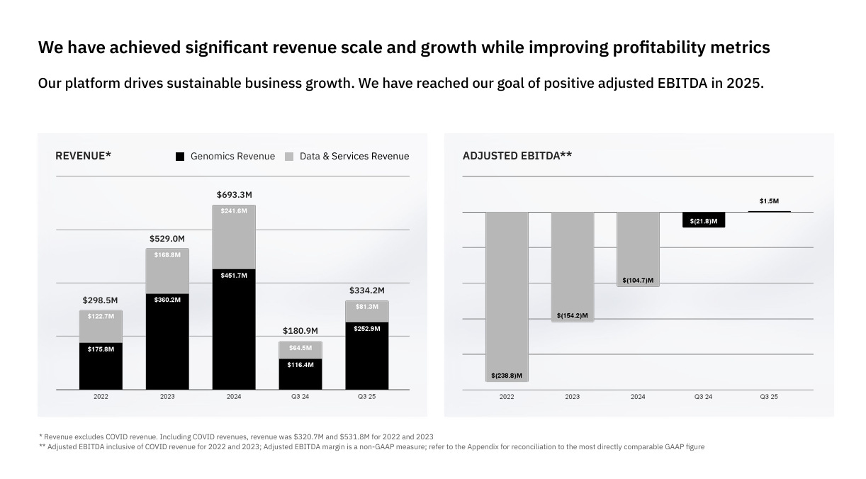 Growing operating leverage — as they scale the high margin data/AI side alongside genomics, we’re seeing adjusted EBITDA improve and a realistic path to GAAP profitability in the next few years.